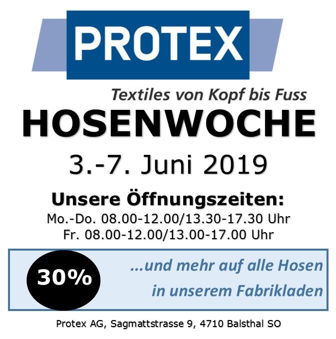 Vom 3.-7. Juni 2019 findet erstmals die Hosenwoche in der Protex AG in Balsthal statt. 30% und mehr auf alle Hosen im Fabrikladen, an der Sagmattstrasse 9 in Balsthal.